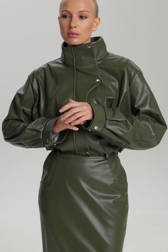 Женский бомбер из экокожи — актуальная модель для создания стильных городских образов. Гладкая фактура материала с мягким матовым блеском придаёт куртке современный и дорогой вид, а свободный крой обеспечивает комфорт в носке. Воротник-стойка, аккуратные кнопки и лаконичный дизайн делают бомбер универсальной базой — он легко сочетается с юбками, брюками и платьями. Модель представлена в бежевом и зеленом оттенках, которые органично вписываются в повседневный и вечерний гардероб. Сочетайте с юбкой из коллекции 1313studio.