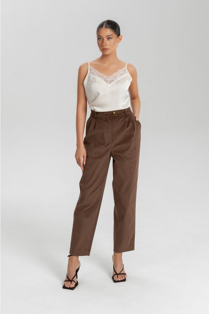 Брюки из вельвета на высокой посадке — идеальный выбор для тех, кто ценит комфорт и стиль. Длина 7/8. Модель выполнена из мягкого, фактурного вельвета коричневого цвета. Благодаря высокой линии талии визуально удлиняют ноги и подчеркивают фигуру. Укороченная длина делает силуэт лёгким и современным.Такие брюки легко комбинировать с рубашками, жакетами, водолазками и обувью на каблуке или без — универсальный вариант для офиса, прогулок и повседневных образов. Сочетайте с жакетом из коллекции 1313studio.