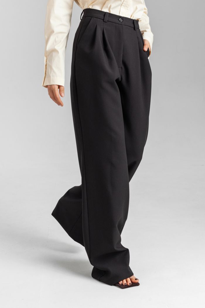 Женские брюки палаццо с защипами – стильный элемент базового гардероба.Эти широкие брюки идеально подойдут для создания элегантных и расслабленных образов. Модель выполнена из плотной костюмной ткани, благодаря чему сохраняет форму и выглядит дорого. Защипы спереди добавляют легкости силуэту, а низкая посадка придает современный и стильный вид. Брюки универсальны: их можно носить с жакетом для делового образа или сочетать с кроп-топом для повседневного шика.