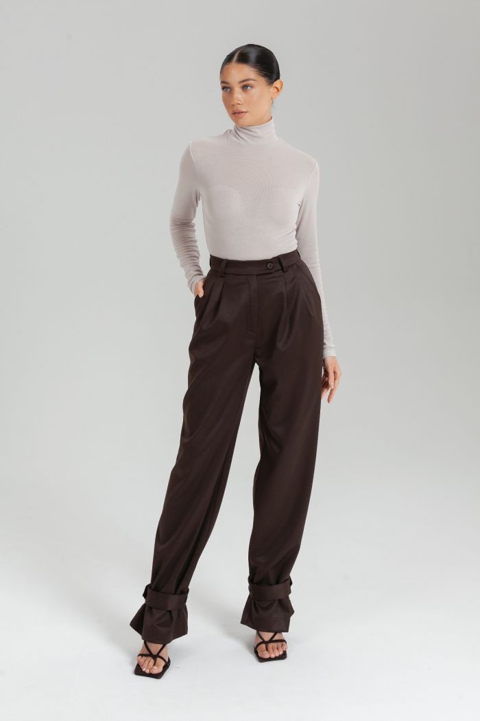 Брюки-палаццо со съемными защипами на щиколотке — универсальная модель-трансформер, которая позволяет менять силуэт от широкого расклешенного до аккуратного зауженного. Изготовлены из плотного материала, держат форму и обеспечивают комфорт в носке. Благодаря лаконичному крою и современной детали в виде хлястиков брюки легко вписываются как в деловой гардероб, так и в повседневные образы. Сочетайте с жакетом из коллекции.