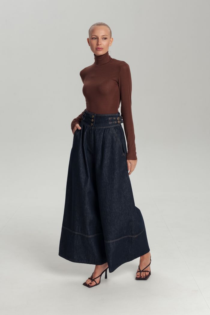 Джинсы кюлоты — актуальная модель для современного гардероба, сочетающая комфорт и выразительный силуэт. Широкие брючины и укороченная длина визуально вытягивают ноги, а высокая посадка подчёркивает линию талии. Плотный деним глубокого синего оттенка делает модель универсальной: джинсы легко комбинируются с рубашками, жакетами, трикотажем и базовыми топами. Подойдут для повседневных образов, офиса в стиле smart casual и городских выходов. Сочетайте с курткой из джинсы в коллекции 1313studio.