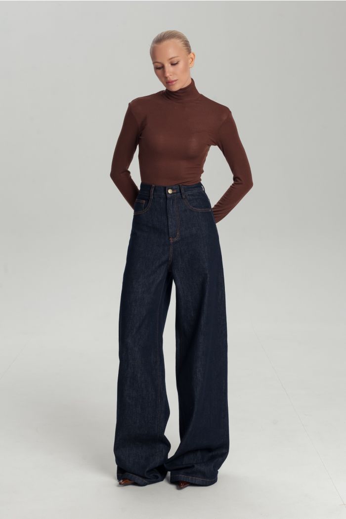 Джинсы палаццо — эффектная модель с выразительно широкими брючинами от бедра и высокой посадкой. Силуэт визуально удлиняет ноги, подчёркивает талию и создаёт стильный, собранный образ. Глубокий синий оттенок денима легко вписывается в повседневный и более нарядный гардероб. Джинсы отлично сочетаются с рубашками, облегающими топами, жакетами и трикотажем. Подойдут для офиса, встреч и городских выходов. Сочетайте с джинсовой курткой из коллекции 1313studio.