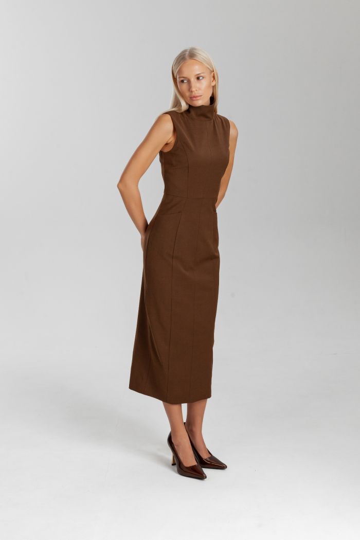 Платье-футляр со стойкой — воплощение элегантности и лаконичного стиля.Модель выполнена из плотной костюмной ткани, хорошо держащей форму и подчёркивающей силуэт. Высокая стойка визуально вытягивает линию шеи, а вытачки обеспечивают идеальную посадку по фигуре. Платье длины миди — универсальный вариант для офиса, ужина или деловой встречи. Доступно в бежевом и коричневом цветах — натуральных оттенках, которые легко сочетаются с жакетами, пальто и аксессуарами. Идеально подходит для тех, кто ценит минимализм, женственность и современную классику.