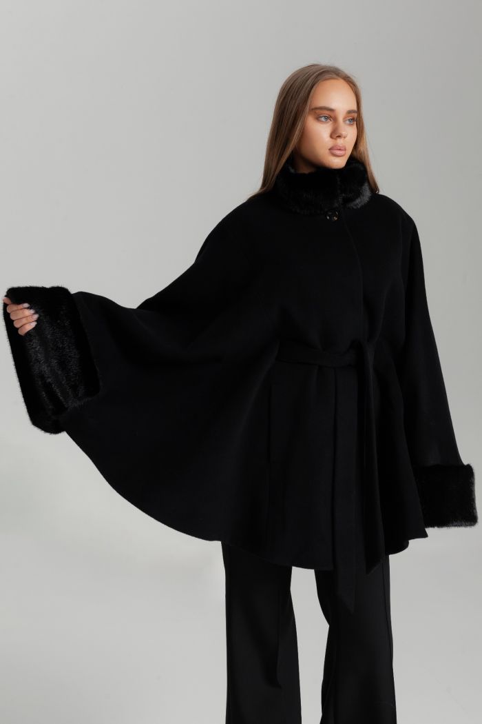 Пальто-пончо — эффектная альтернатива классическому пальто для создания выразительных и женственных образов. Свободный крой красиво драпируется, дарит комфорт и подчёркивает изящество силуэта. Модель дополнена меховой отделкой на воротнике и манжетах, что добавляет изделию статусность и делает его идеальным выбором для прохладного сезона. Пояс позволяет регулировать посадку и создавать более акцентированный силуэт. Пончо представлено в базовых оттенках — чёрном и коричневом, которые легко интегрируются в повседневный и вечерний гардероб.