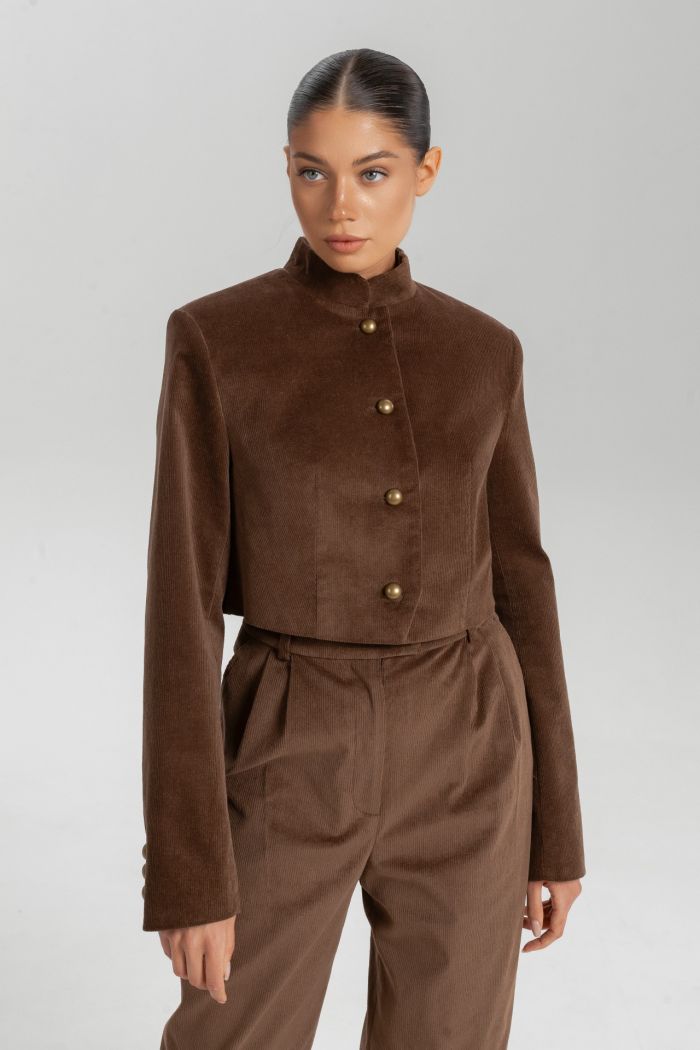 Укороченный жакет из вельвета — стильная и универсальная вещь для современных образов. Изделие выполнено из мягкого фактурного вельвета, украшено пуговицами в цвете винтажного золото, что придаёт образу лёгкий ретро-шарм. Идеально сочетается с брюками, юбками или платьями, подчеркивая талию и создавая женственный силуэт.Сочетайте с брюками из коллекции 1313studio.