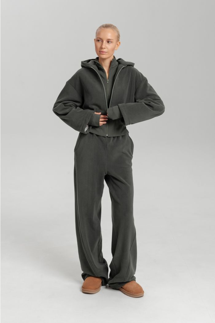 Стильный женский костюм-тройка из мягкого флиса сочетает комфорт и современный дизайн. В комплект входит укороченное худи с капюшоном и кулиской по низу, приталенный топ на молнии с корсетным силуэтом и брюки свободного кроя с регулируемым низом. Костюм идеально подходит для прогулок, отдыха и стильных повседневных образов. Благодаря универсальному фасону и актуальной цветовой палитре легко комбинируется с обувью и верхней одеждой, создавая уютный и модный look.